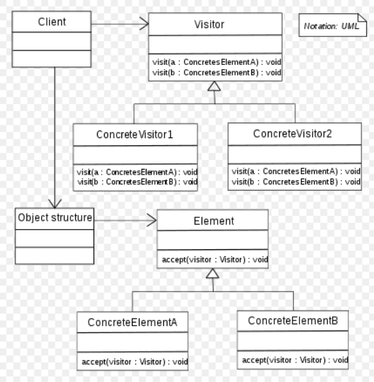 wiki: In object-oriented programming and software engineering, the visitor design pattern is a way of separating an algorithm from an object structure on which it operates. A practical result of this separation is the ability to add new operations to existent object structures without modifying the structures. It is one way to follow the open/closed principle.